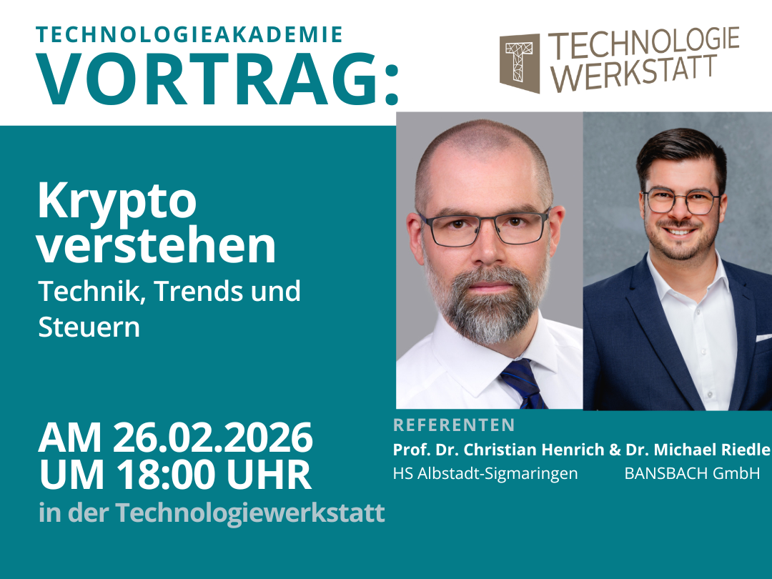 Prof. Dr. Christian Henrich von der Hochschule Albstadt-Sigmaringen beleuchtet die Historie, Technik und Trends digitaler Währungen, während Dr. Michael Riedle von der BANSBACH GmbH die steuerlichen sowie rechtlichen Aspekte verständlich einordnet. Im Anschluss bietet eine offene Fragerunde mit anschließendem Get-together Raum für persönlichen Austausch und vertiefende Gespräche.